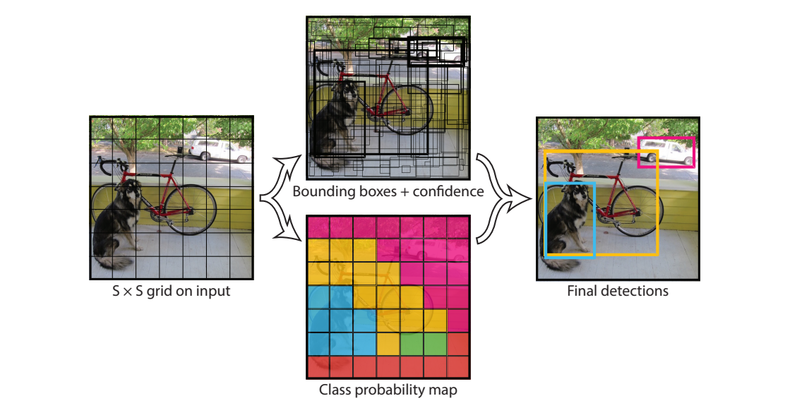 This entire process is done in one single forward pass, which is why YOLO is called a single-shot detector.