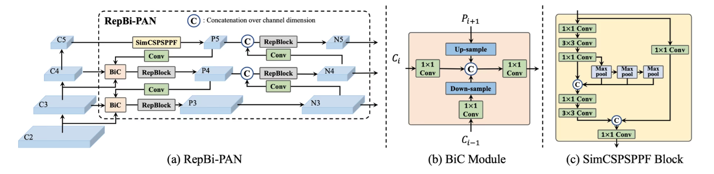 - Neck: The architecture adopts the PANet-style topology (from YOLOv4/v5) to fuse features across scales. YOLOv6 enhances this structure into RepPAN by inserting RepBlocks or CSPStackRep blocks, improving multi-scale feature fusion.