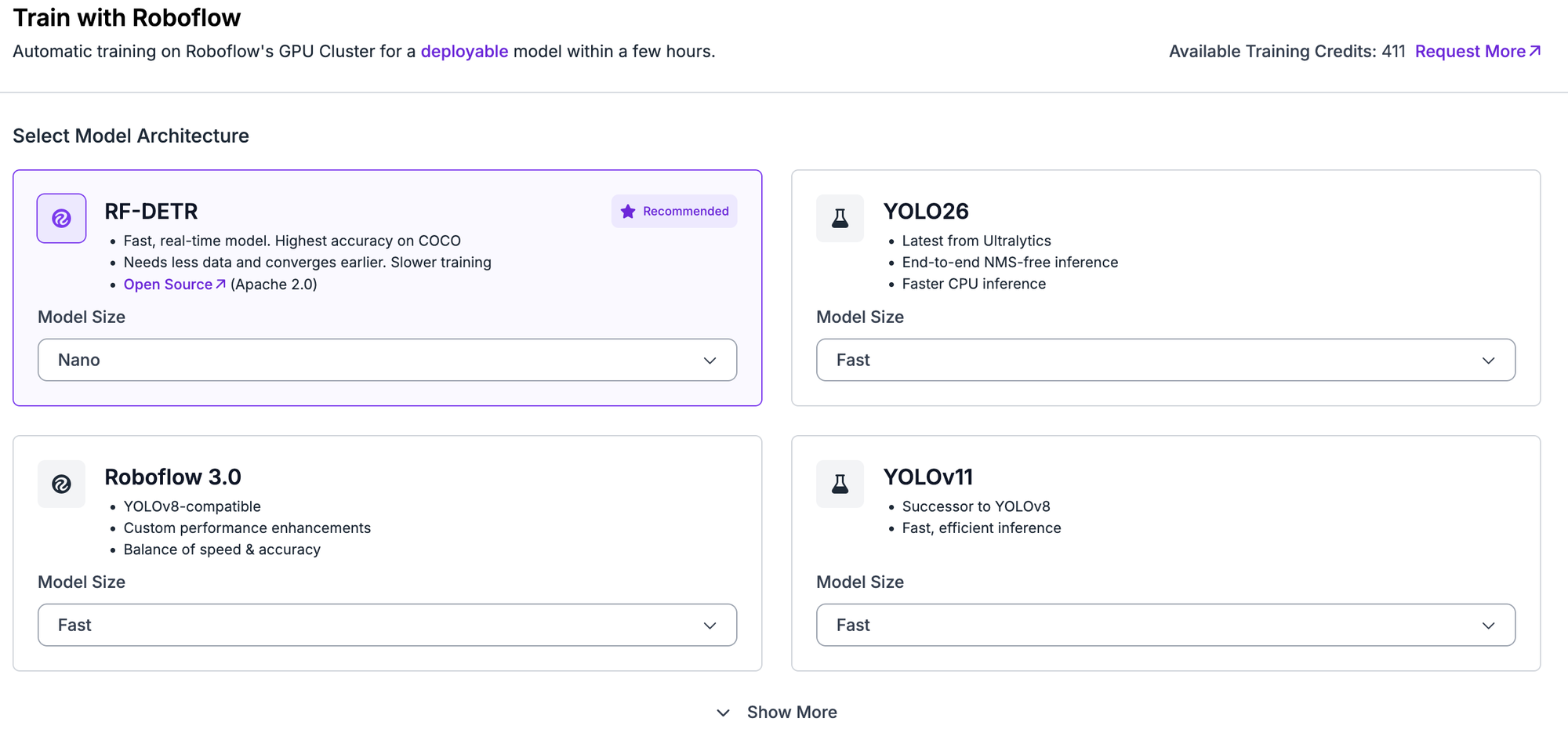 You can train YOLO26 object detection, instance segmentation, and keypoint detection models directly on the Roboflow-hosted platform using Roboflow Train. This allows you to fine-tune the model on your custom dataset with just a few clicks, no hardware setup required.