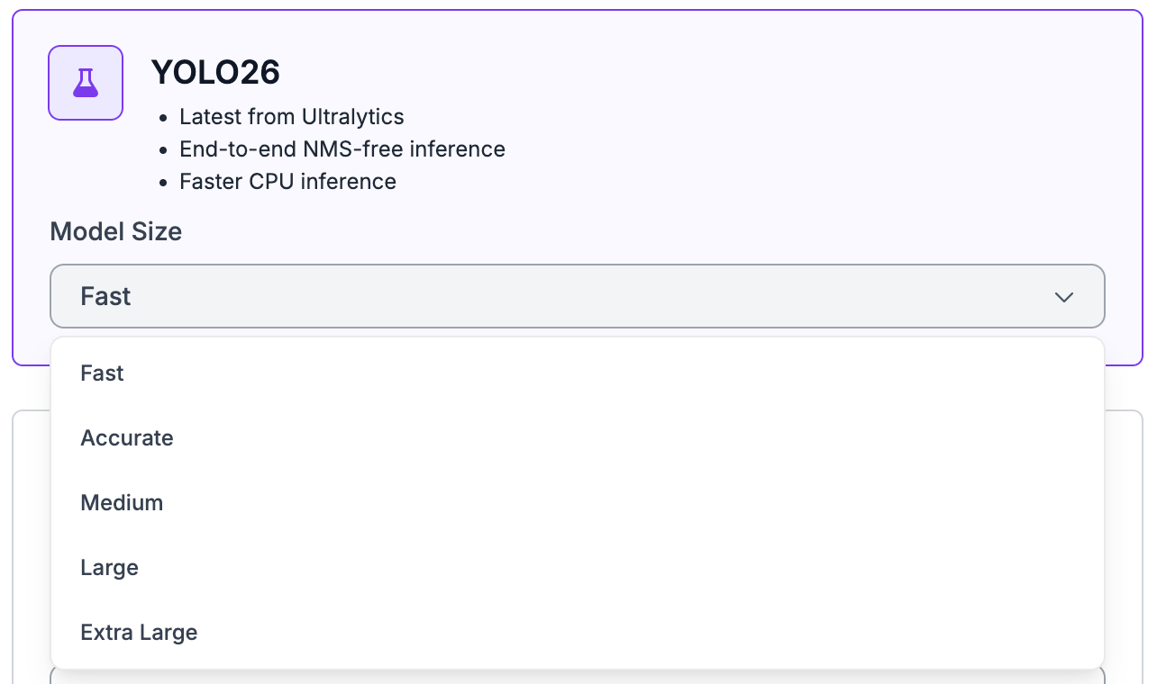 You can choose between different model sizes, including Nano (N), Small (S), Medium (M), Large (L), and Extra Large (X). Refer to the YOLO26 performance table in the post to understand the various sizes and speeds so you can choose the best model for your use case.