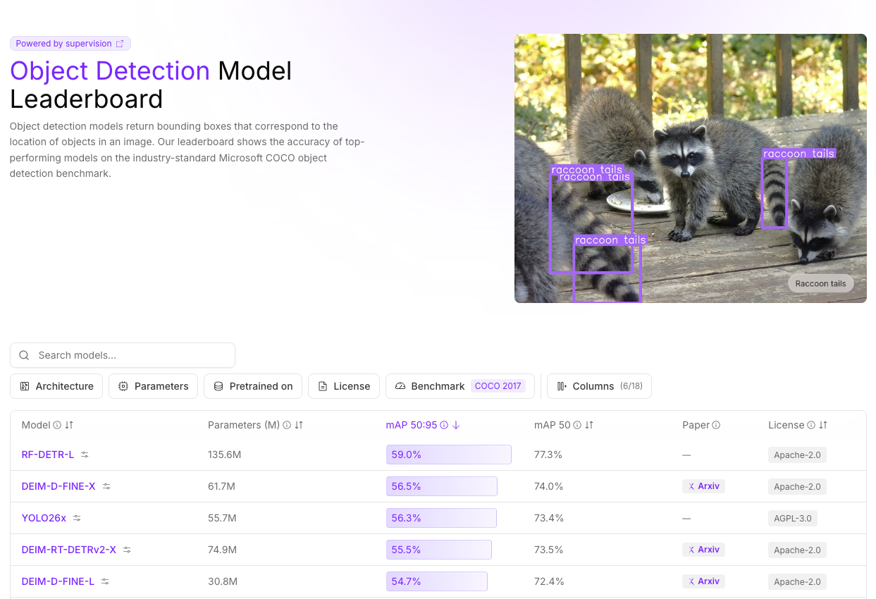 RF-DETR, developed by Roboflow and released in March 2025, is a family of real-time detection models that support segmentation, object detection, and classification tasks. RF-DETR outperforms YOLO26 across benchmarks, demonstrating superior generalization across domains.