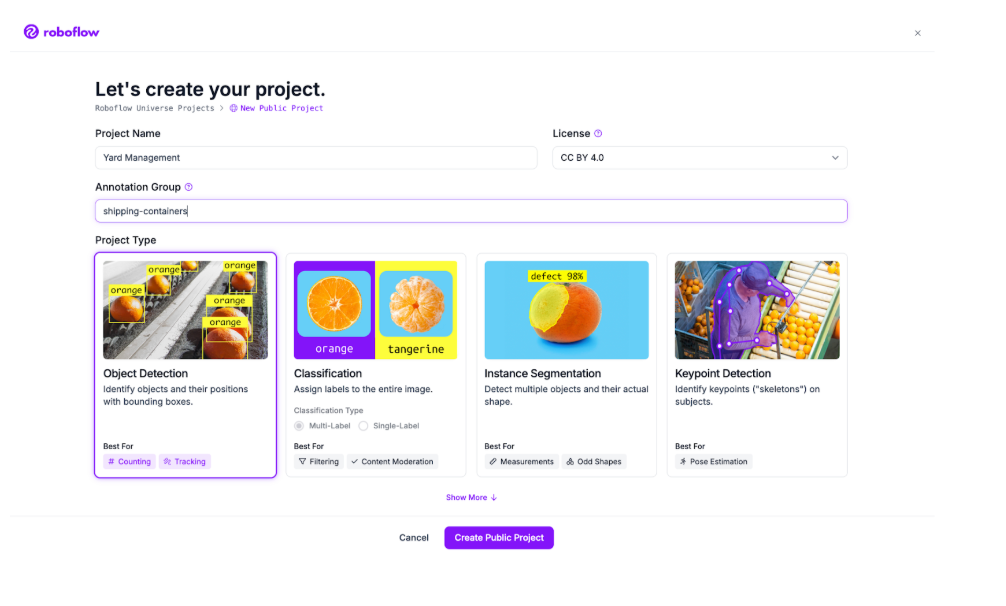 On this page, set a name for your project. Choose “Object Detection” as your project type.