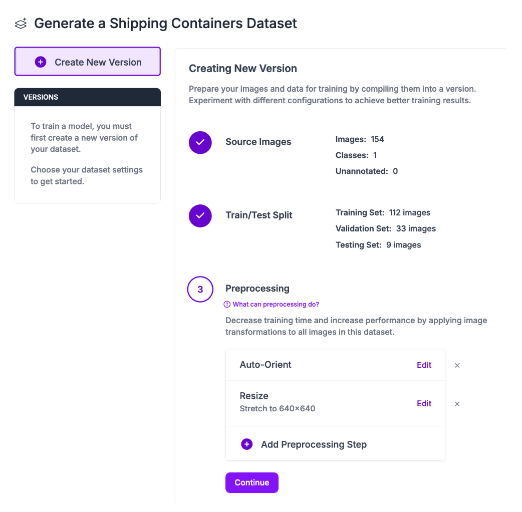 On this page, you can apply preprocessing steps and augmentations. For your first model version, we recommend leaving the preprocessing steps as the default and applying no augmentations. This will allow you to calculate baseline performance with your dataset.