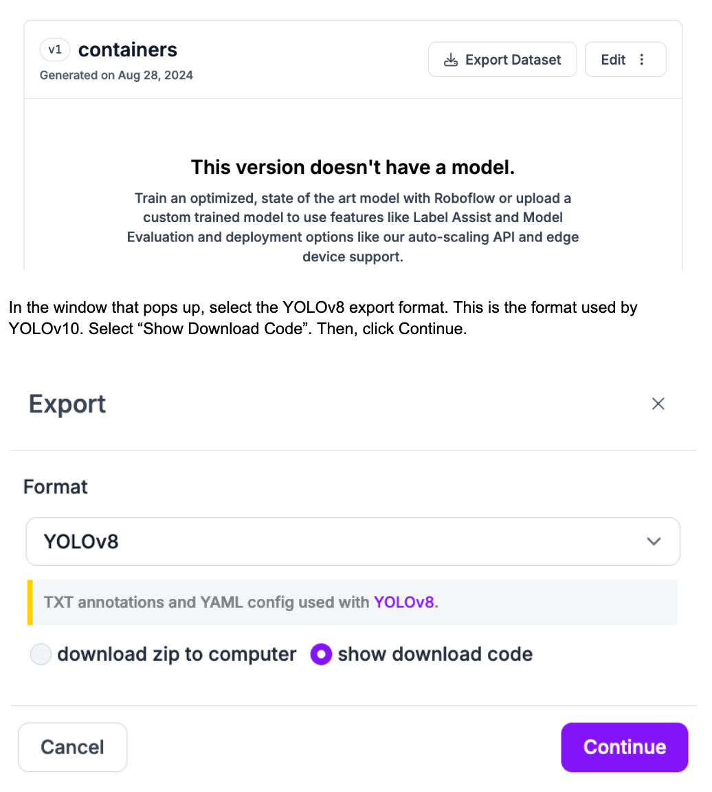 In the window that pops up, select the YOLOv8 export format. This is the format used by YOLOv10. Select “Show Download Code”. Then, click Continue.