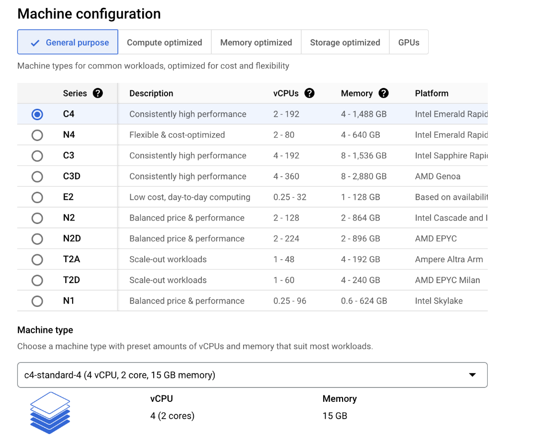 You will be taken to a page where you can set up your new machine. On this page, select the C4 server type. This server uses Emerald Rapids.