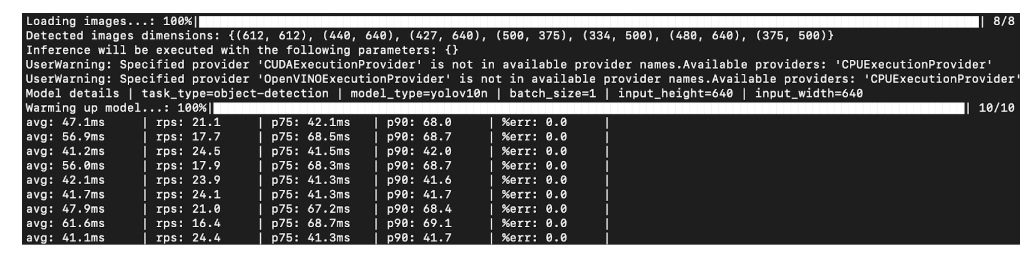 You can benchmark the performance of Inference on your device using the inference benchmark command. This command runs a specified model on images in a folder or your Roboflow dataset. Model latency and FPS is computed and returned in a table.