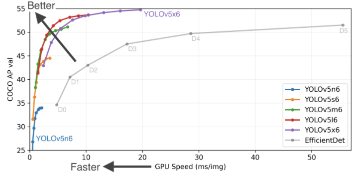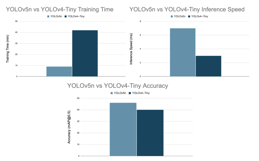 In the chart below, we compared the training time and inference speed of YOLov5n vs YOLOv4-tiny. We also include COCO mAP accuracy metrics for context.