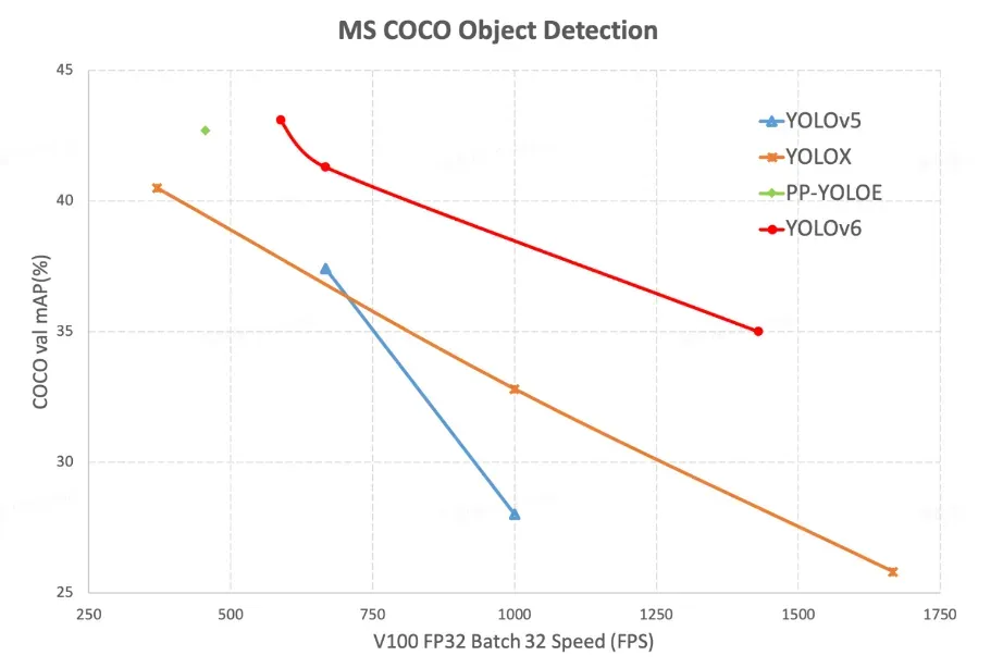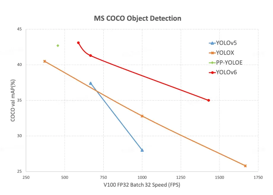 The above chart shows that YOLOv6 is a clear winner compared to the other YOLO models. YOLOv6 achieves a higher mAP compared to YOLOv5, YOLOX, and PP-YOLOE at all V100 FP32 Batch 32 speeds tested.
