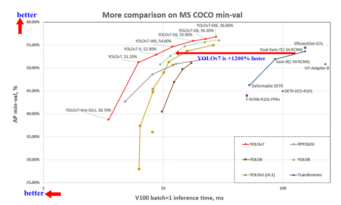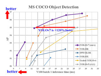The YOLOv7 authors sought to set the state of the art in object detection by creating a network architecture that would predict bounding boxes more accurately than its peers at similar inference speeds.