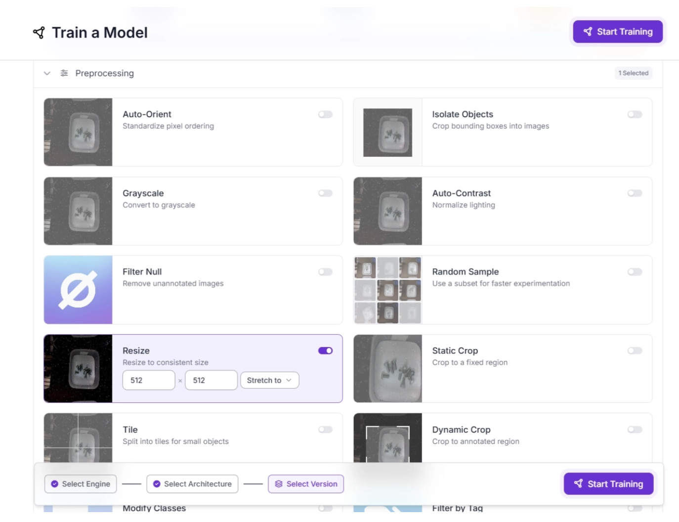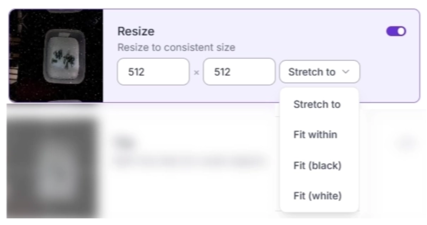 After selecting a model architecture in Roboflow Train, you can apply Resize preprocessing by simply toggling it on, as shown below. You can also create a new dataset version with this preprocessing step applied to all images in the dataset.