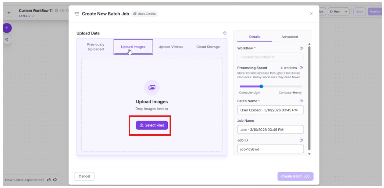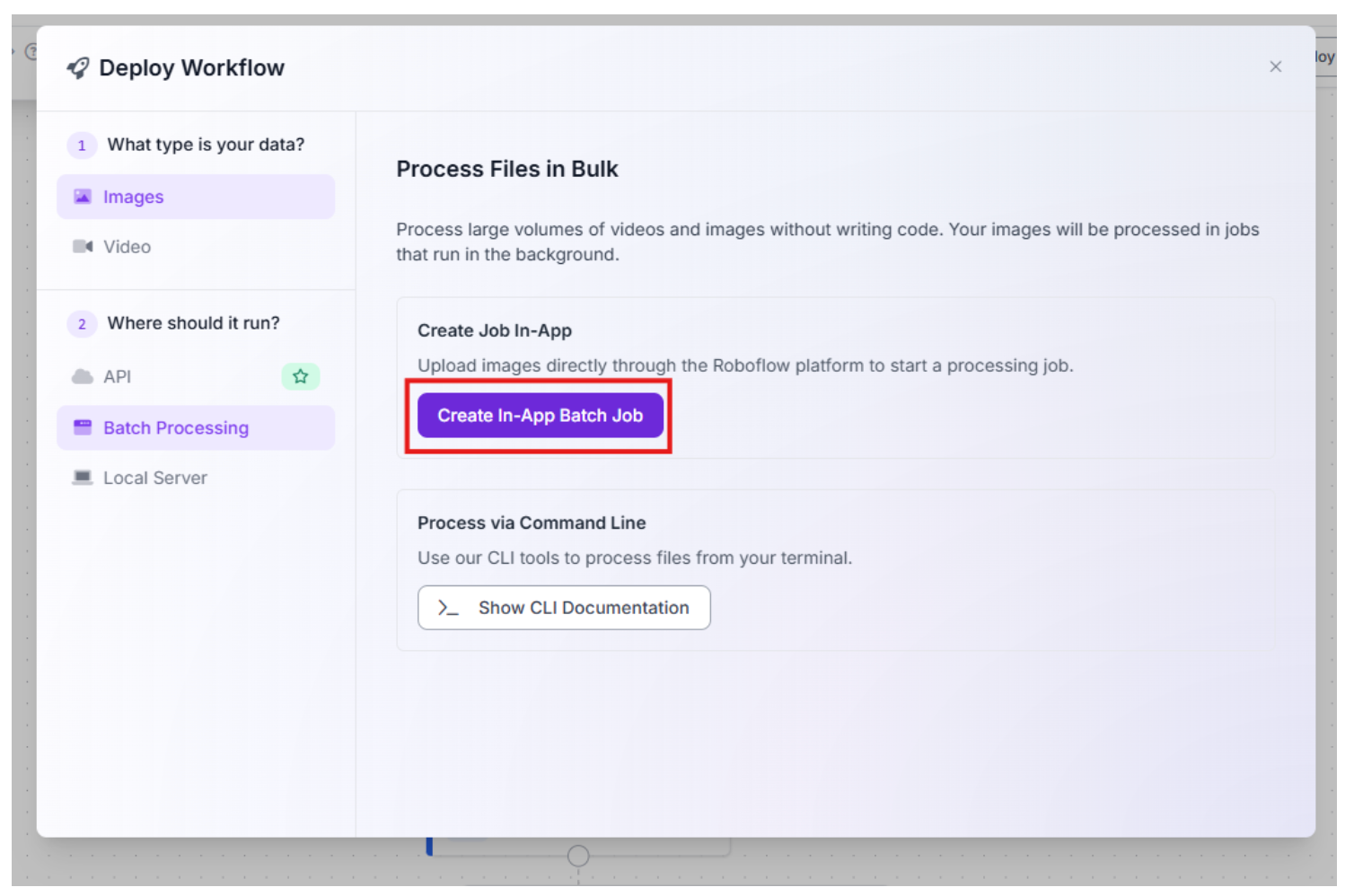 - Initiate the Batch Job: Navigate to the Deploy button in the top right corner of your workflow. From the dropdown menu, select Batch Processing and click on Create in-app batch job.