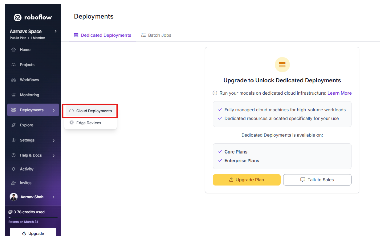 Next, navigate to the Cloud Deployments tab on your Roboflow homepage.