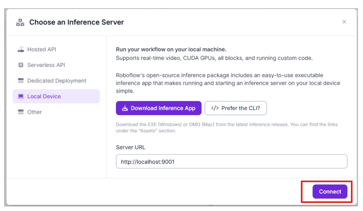 Roboflow's open-source inference package includes an easy-to-use executable inference app that makes starting a server on your local device simple. By using Docker, the application creates a "container" that holds all the complex AI dependencies, like PyTorch and CUDA drivers, so you don't have to manage them manually.