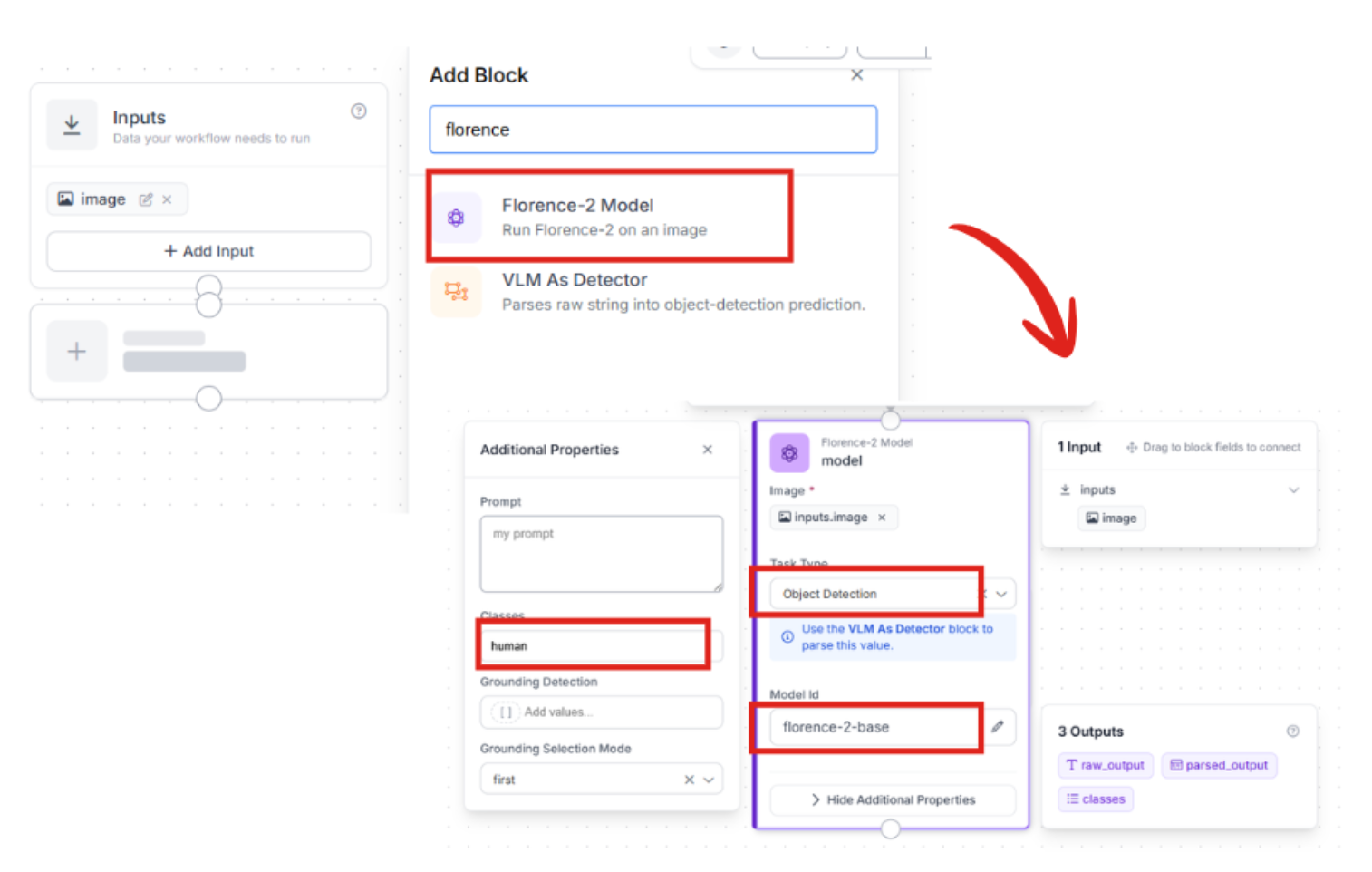 Add the Florence-2 Model block to your workflow canvas. This block serves as the "brain" of the operation. In the configuration settings: