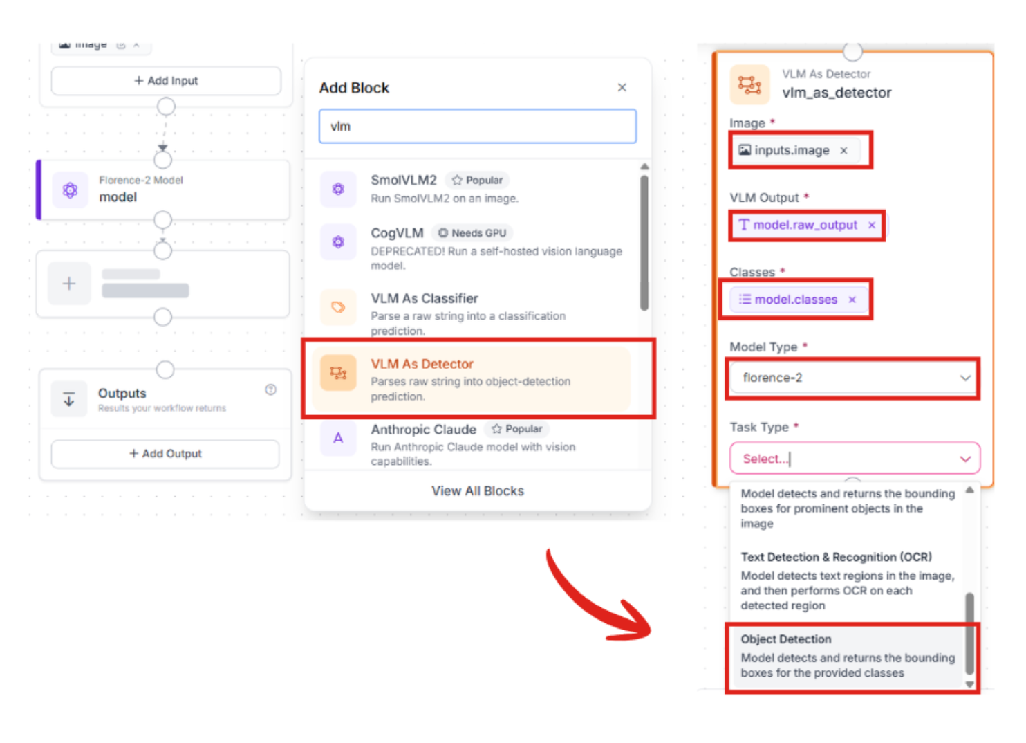 Raw output from a VLM is often just text or unformatted coordinates. The VLM as Detector block is the most important part of the bridge. It parses the output from Florence-2 and converts it into a standard detection format. This ensures the "reasoning" from the VLM is translated into structured data that Roboflow can save as an annotation. For this, firstly, add the VLM as a Detector block into the workflow and connect it to the previous block. Select all inputs and ensure that the model is selected for Florence-2. Lastly, ensure that the task-type is set to object detection so that the model can detect the objects from the classes that you prompted.