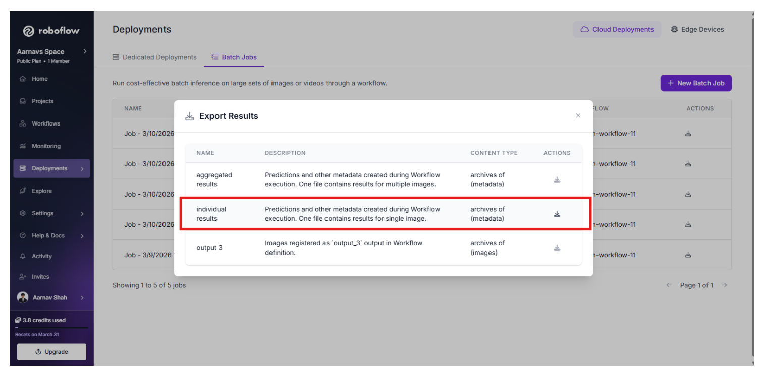 - In the download options, choose Individual Results. This will download a zipped file containing the raw JSON metadata for every image processed.