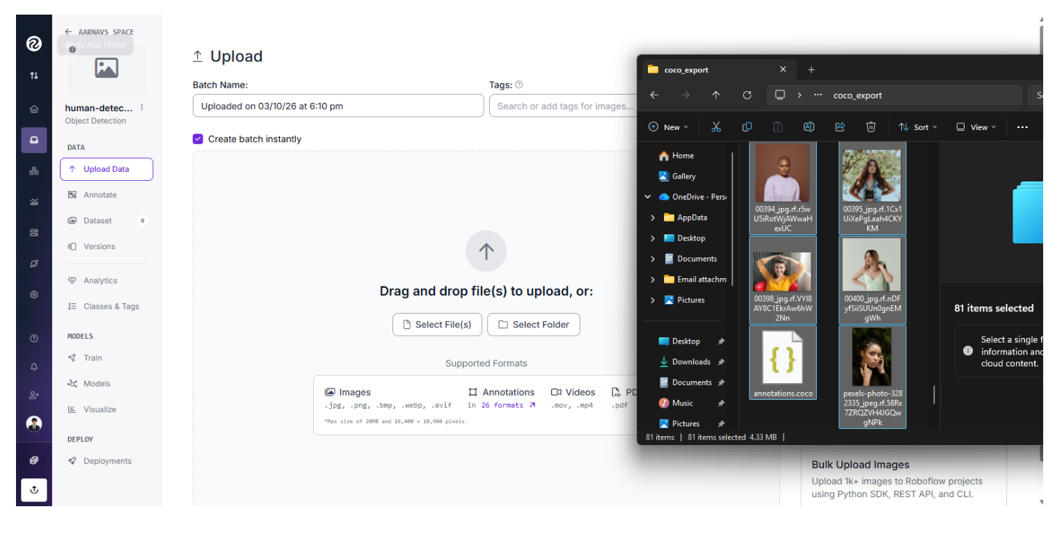 - Drag and drop your original raw images along with the new “annotations.coco.json” file into the upload window.